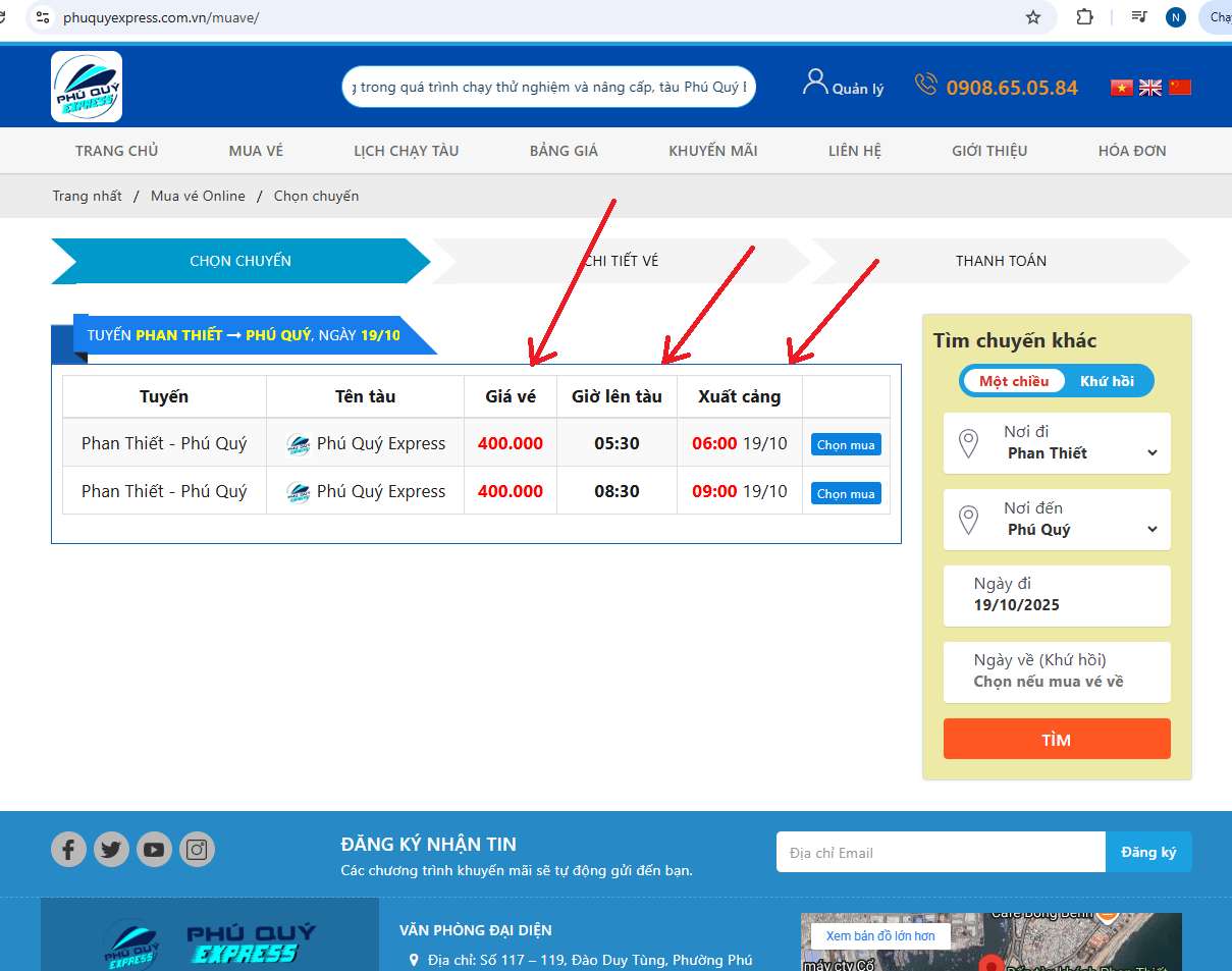 Bước 1: Truy cập website: https://www.phuquyexpress.com.vn/ và chọn hành trình Phan Thiết → Phú Quý hoặc Sài Gòn - Côn Đảo, thời gian đi và tìm. Sau đó chọn chuyến tàu khởi hành có thời gian đi phù hợp với nhu cầu bằng cách click “chọn mua”.
