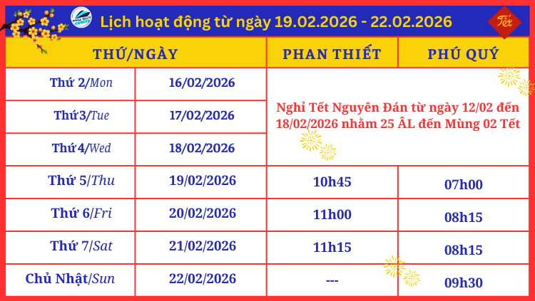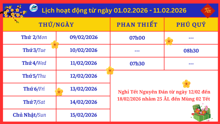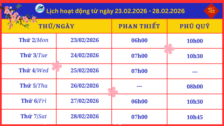Tàu Phú Quý Express xin thông báo tới Quý khách hàng lịch chạy tàu Phan Thiết - Phú Quý 2/2026 như sau: